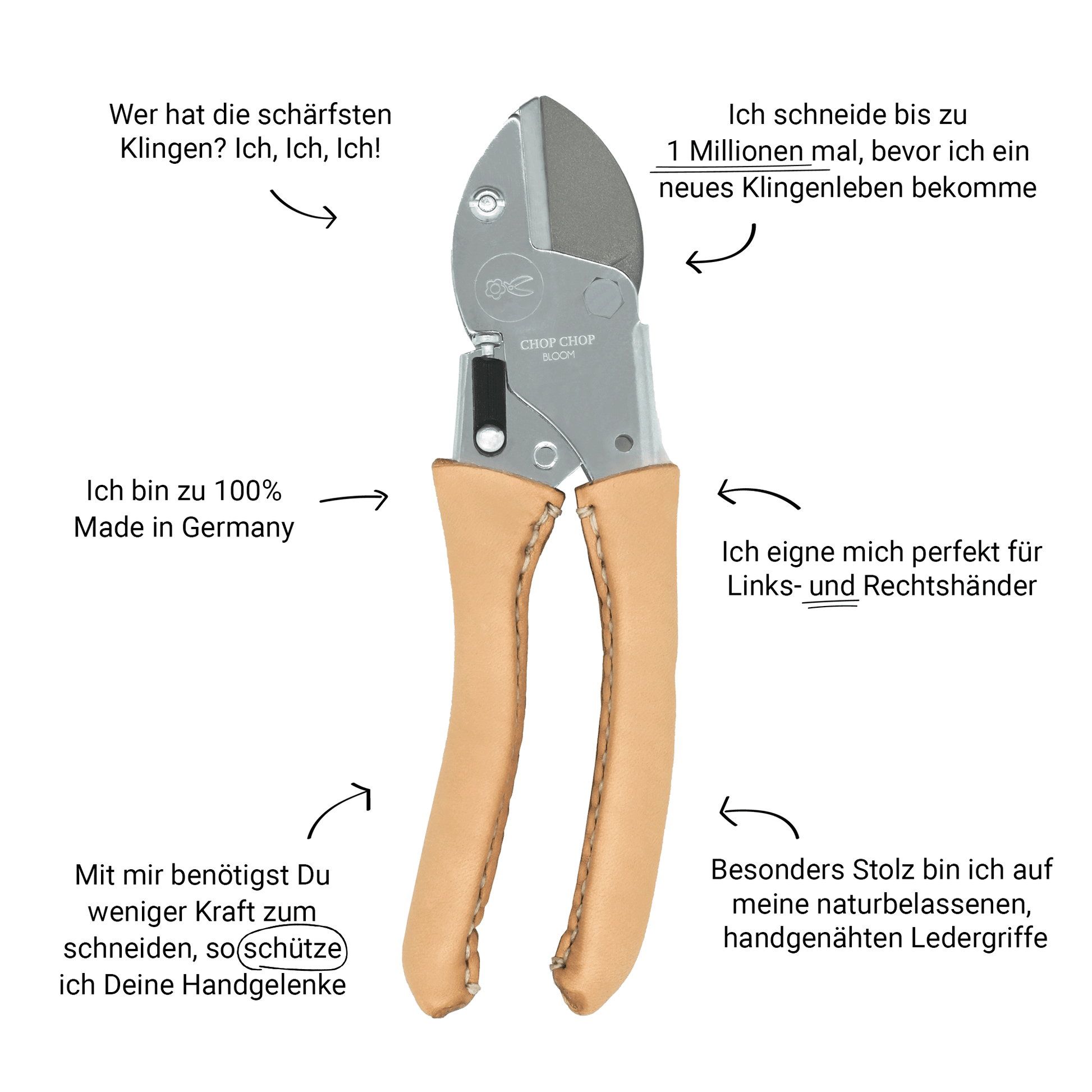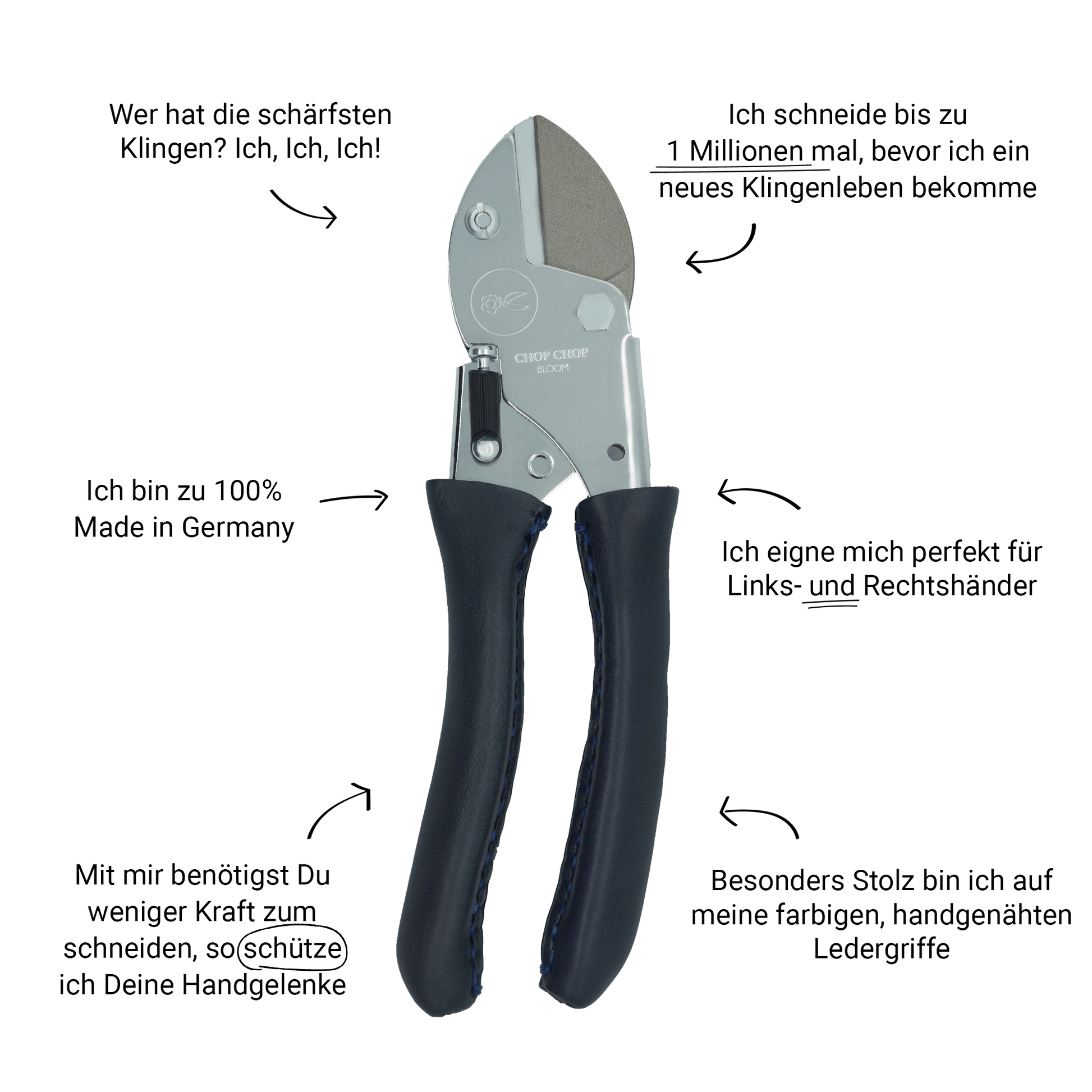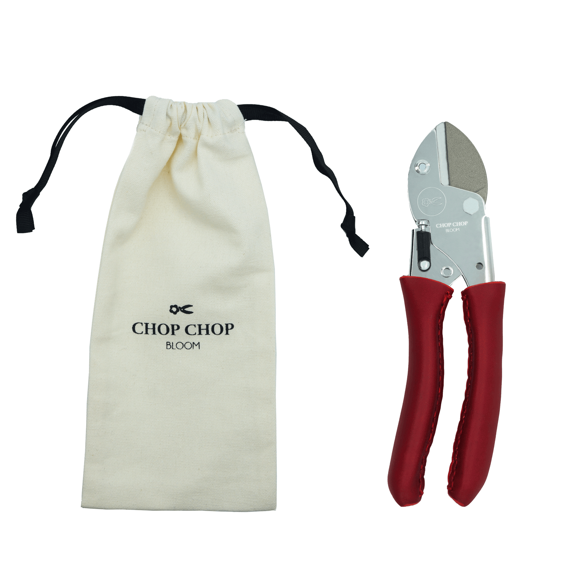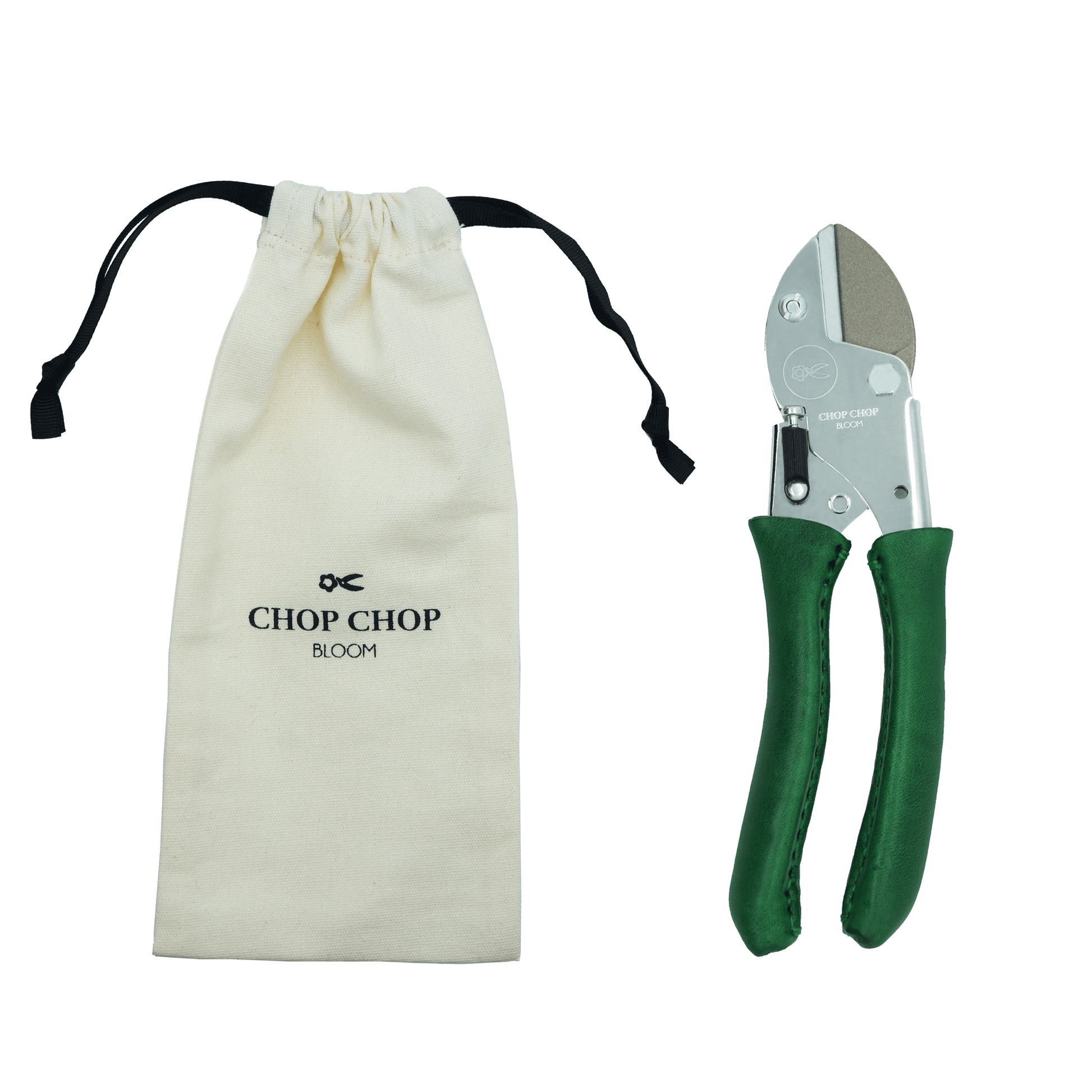 Die Gartenschere Chop Chop Bloom ist eine kraftvolle, leichte und langlebige Gartenschere mit farbigen, handgenähten Ledergriffen.