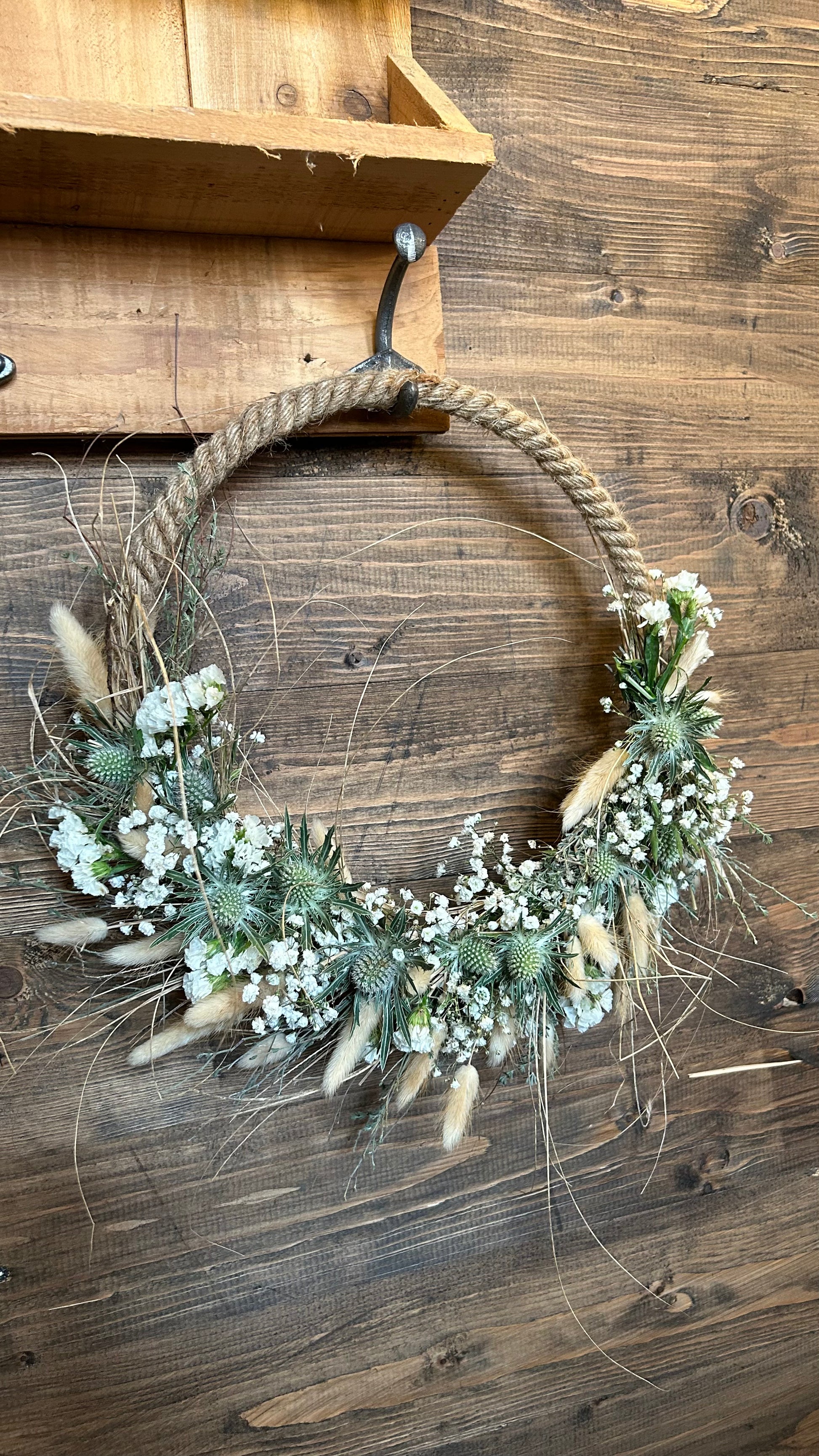 Ein Hauch von Natur, stilvoll arrangiert: Unser handgefertigter halber Kranz kombiniert rustikales Tau mit zarten Trockenblumen, stacheligen Disteln und filigranem Schleierkraut. Die harmonische Farbpalette aus sanften Beige-, Creme- und Grüntönen fügt sich perfekt in jede Einrichtung ein – egal ob Boho, Landhausstil oder modernes Ambiente.