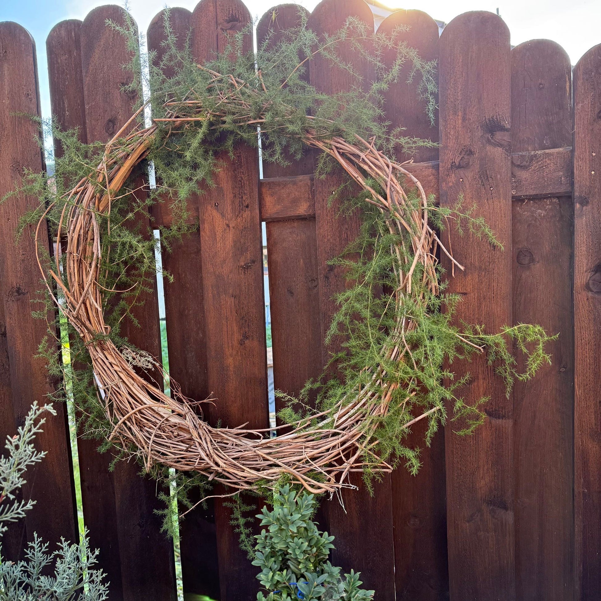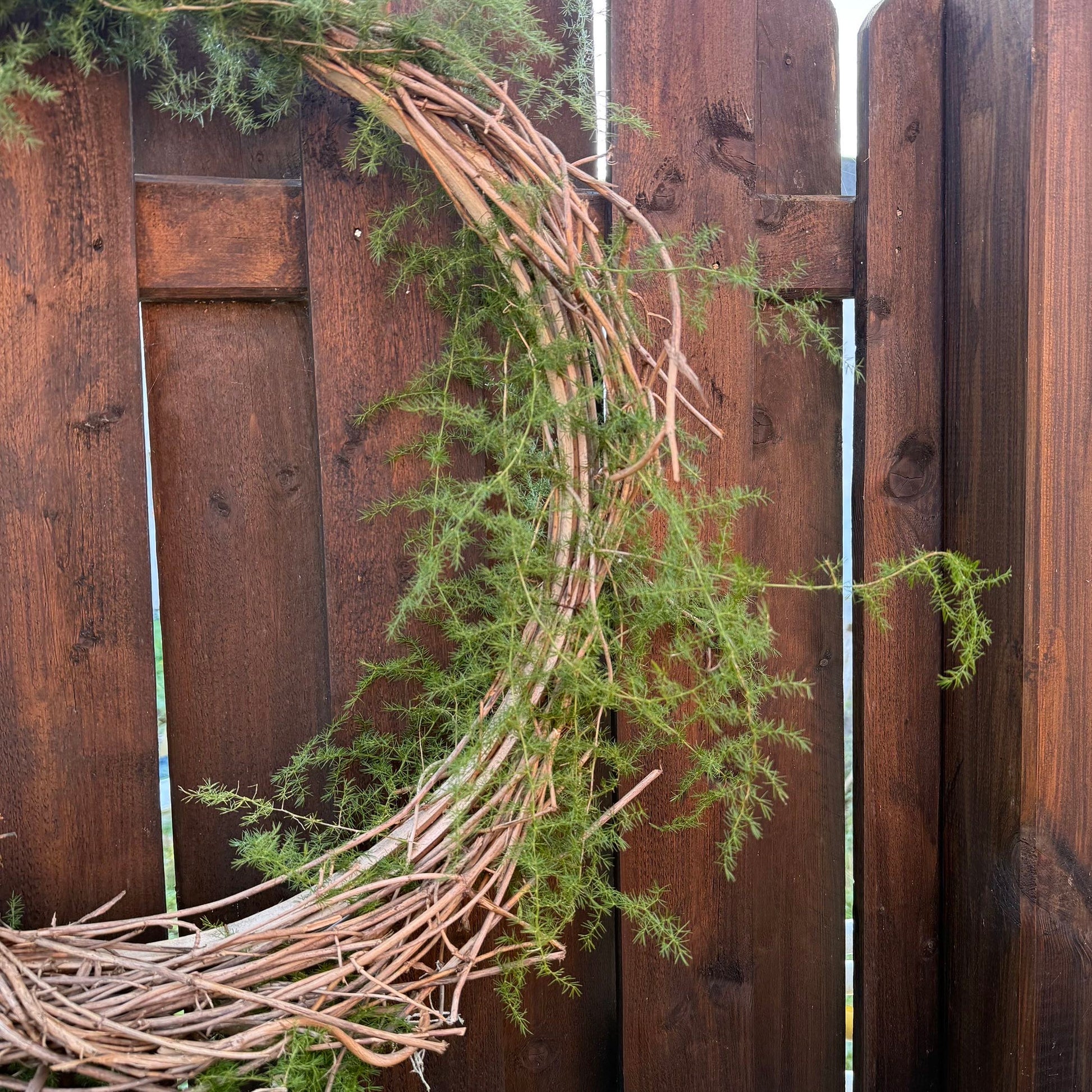 Naturkranz handgefertigt aus einem Weidenreifen, locker umwickelt mit Lonicera und feinem Asparagus, der durch seine schlichte, natürliche Form eine harmonische und zeitlose Ausstrahlung erhält.