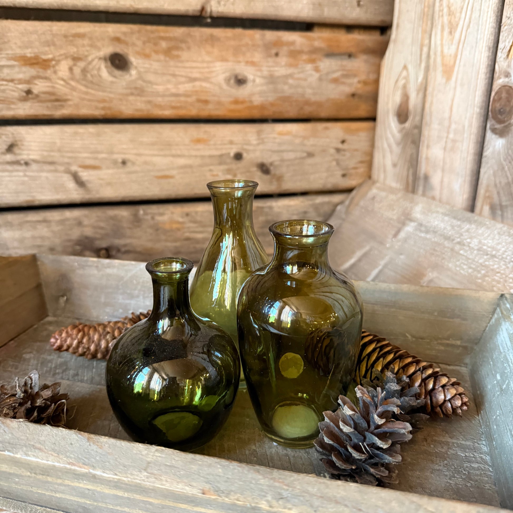 Dekoratives Set aus drei Glasvasen in harmonischen Grüntönen und unterschiedlichen Formen. Perfekt für kleine Blumen, Zweige oder als stilvolles Deko-Highlight. Passt zu modernem und rustikalem Einrichtungsstil.