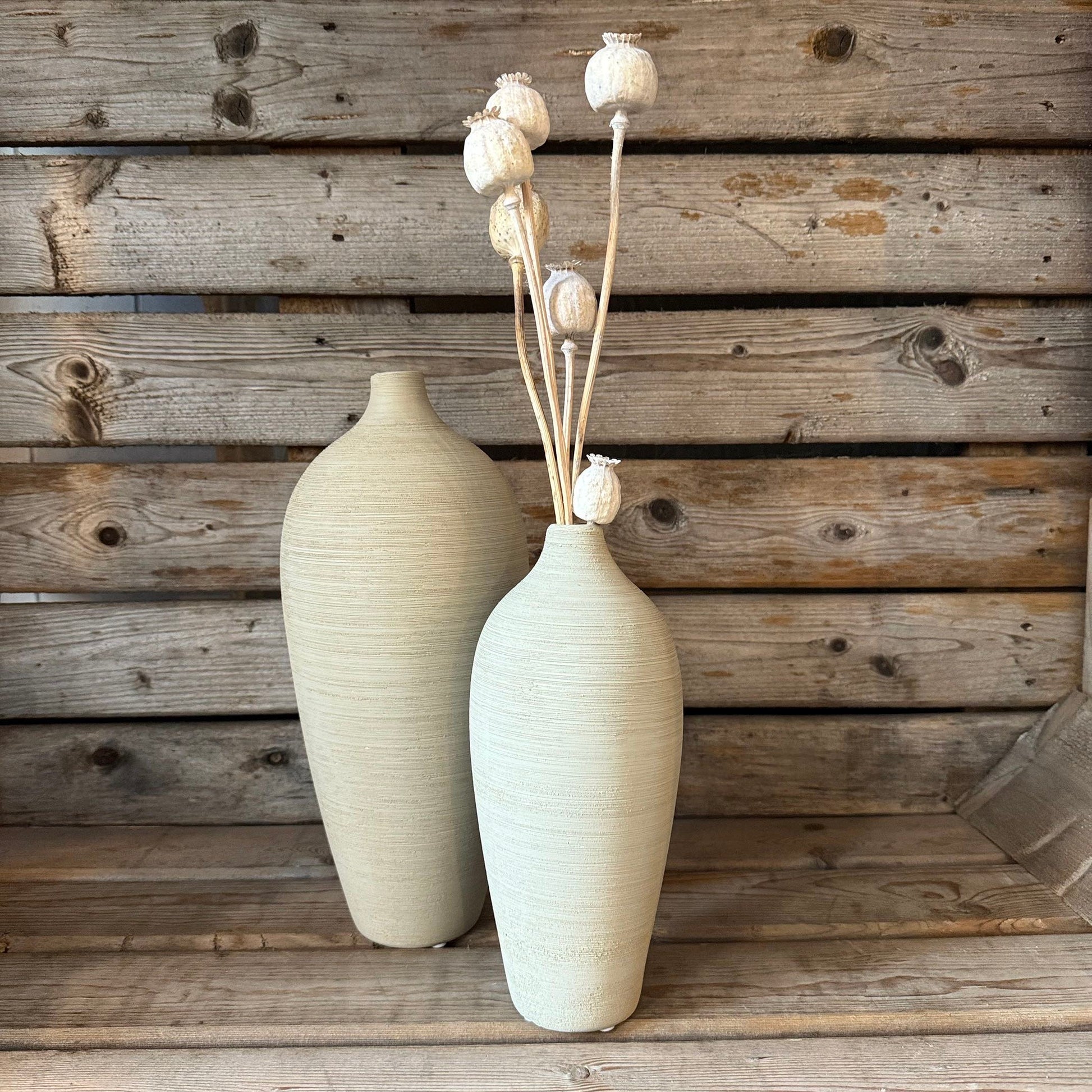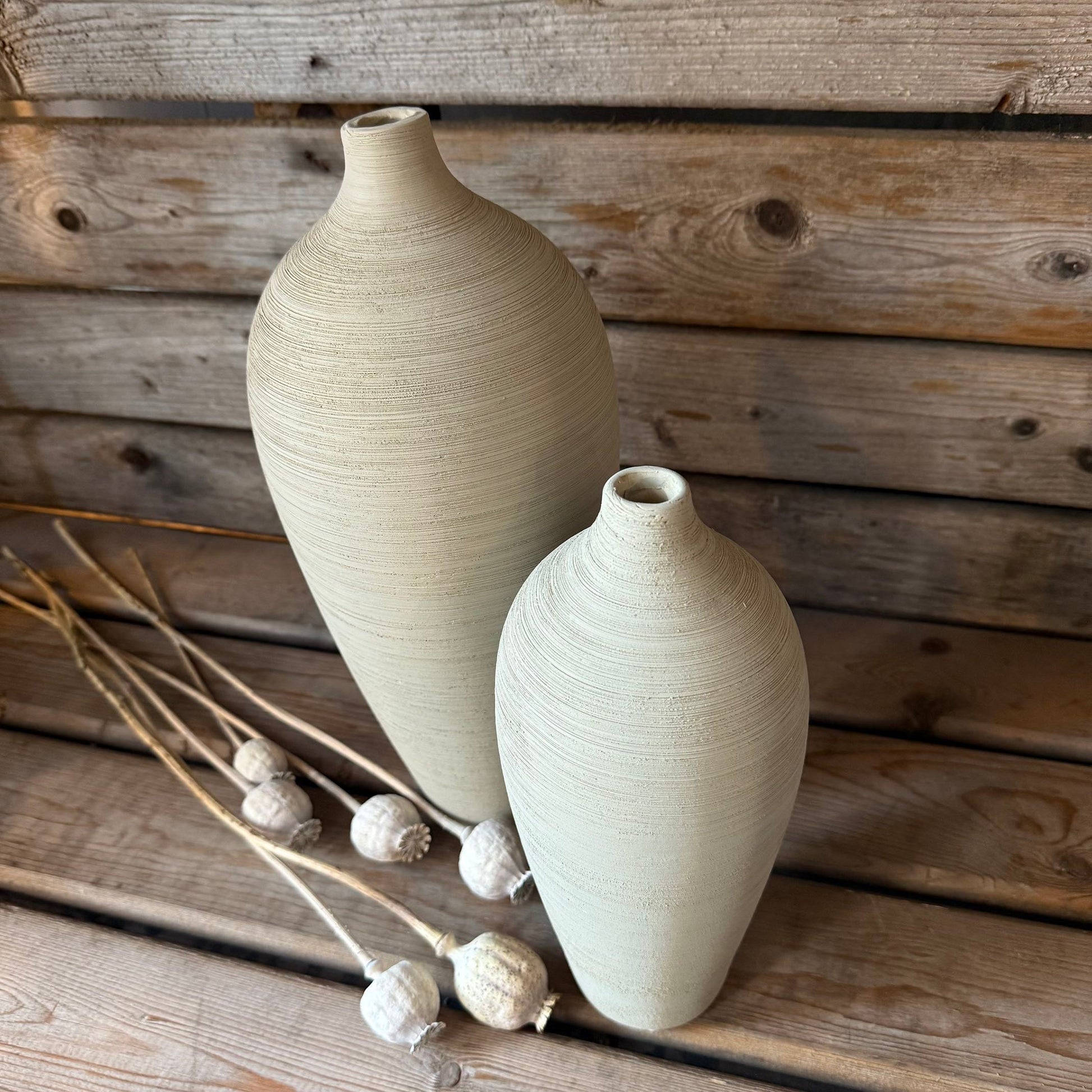 Diese stilvollen Vasen überzeugen durch ihre raue Oberfläche und moderne Form. Die matte Optik verleiht ihnen einen besonders edlen Charakter – perfekt für eine schlichte, elegante Dekoration.